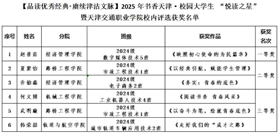 经现场评审,评选出一等奖1名、二等奖2名、三等奖3名及优秀奖若干名。评选获得一等奖的是经济管理学院2024级数字媒体技术5班的赵普苗同学,将代表学院征战天津市“悦读之星”总决赛。以下是获奖名单: