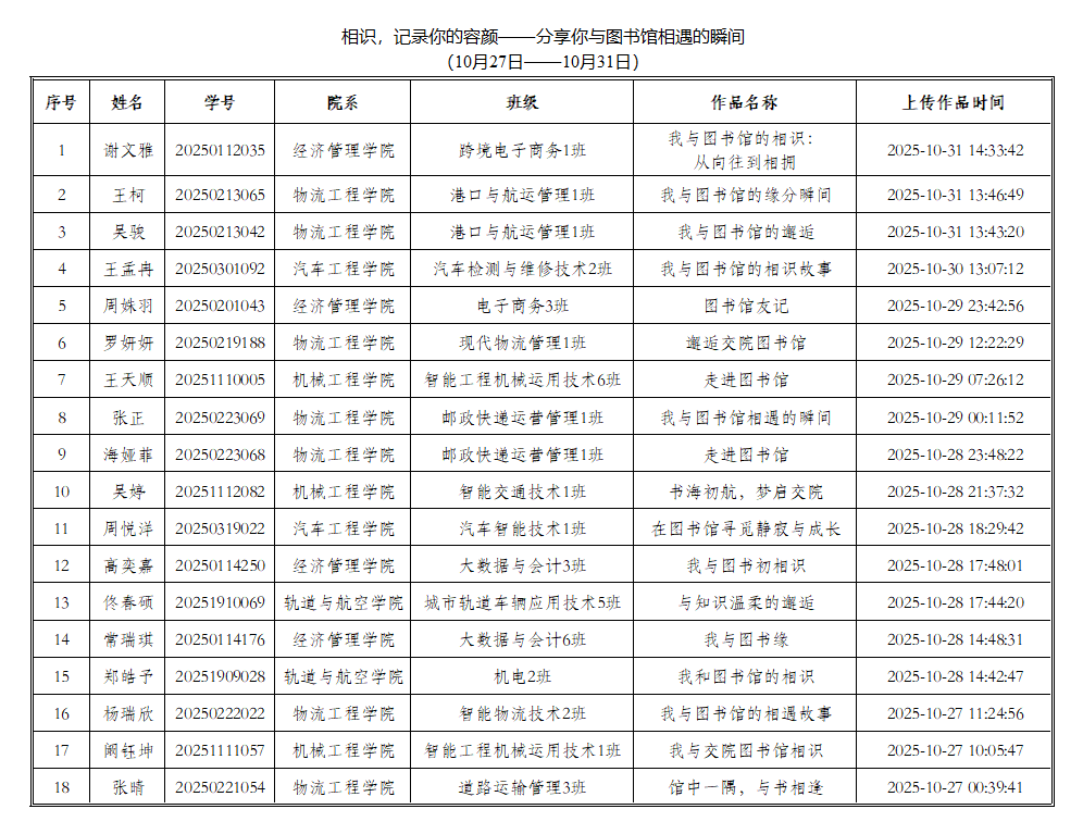 感谢大家积极参与“相识,记录你的容颜——分享你与图书馆相遇的瞬间”活动,你们的热情和创意让我们深感欣喜。经过认真评选,第一批获奖同学的作品脱颖而出,以下是获奖名单: