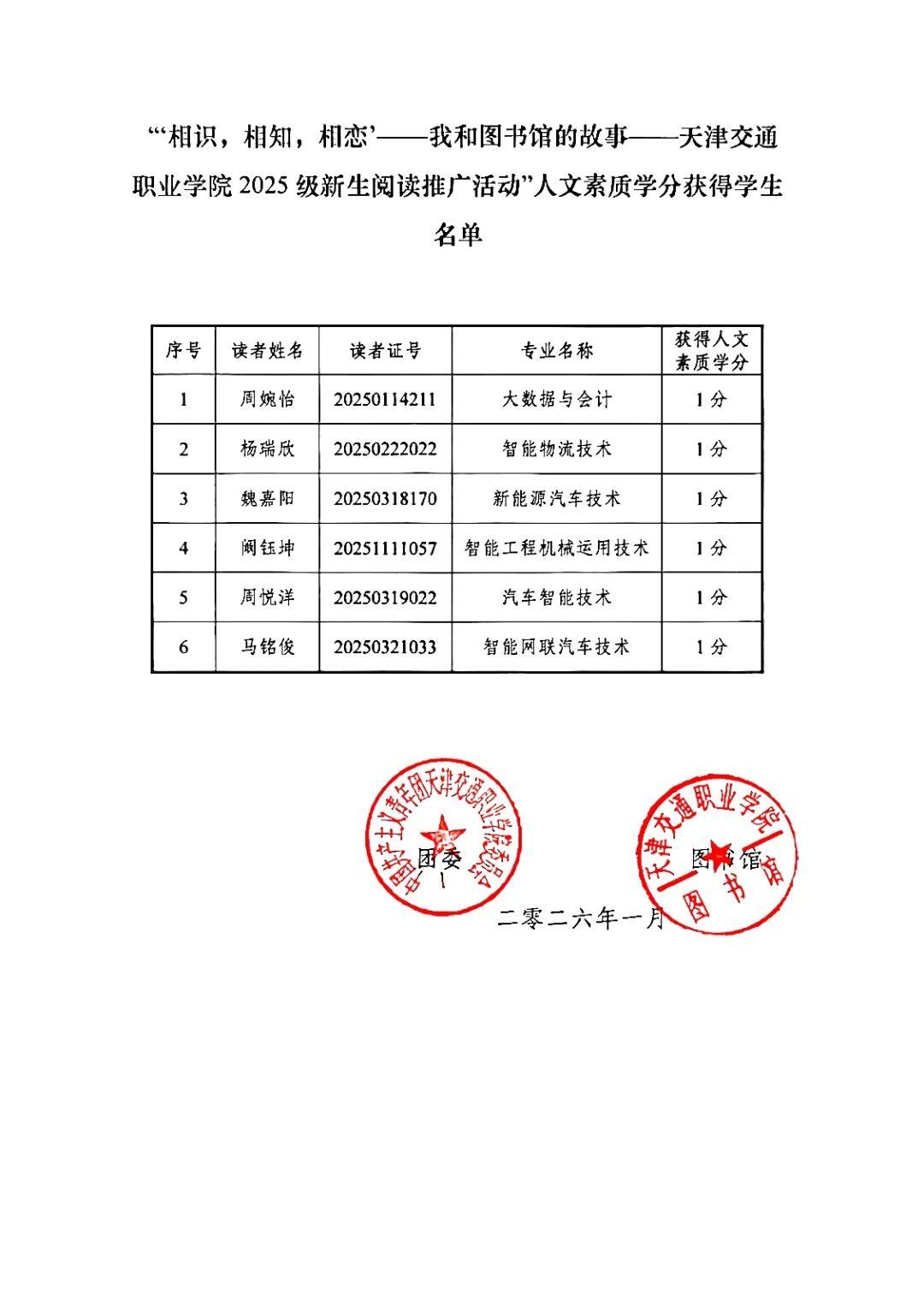 ‘相识,相知,相恋’——我和图书馆的故事——天津交通职业学院2025级新生阅读推广活动”人文素质学分获得学生名单