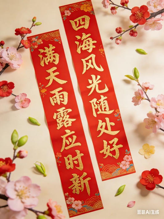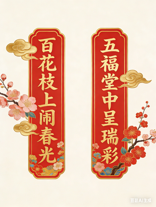 五福堂中呈瑞彩;百花枝上闹春光。 ——选自清光绪二十四年(1898)继文堂刻本《对联大观》